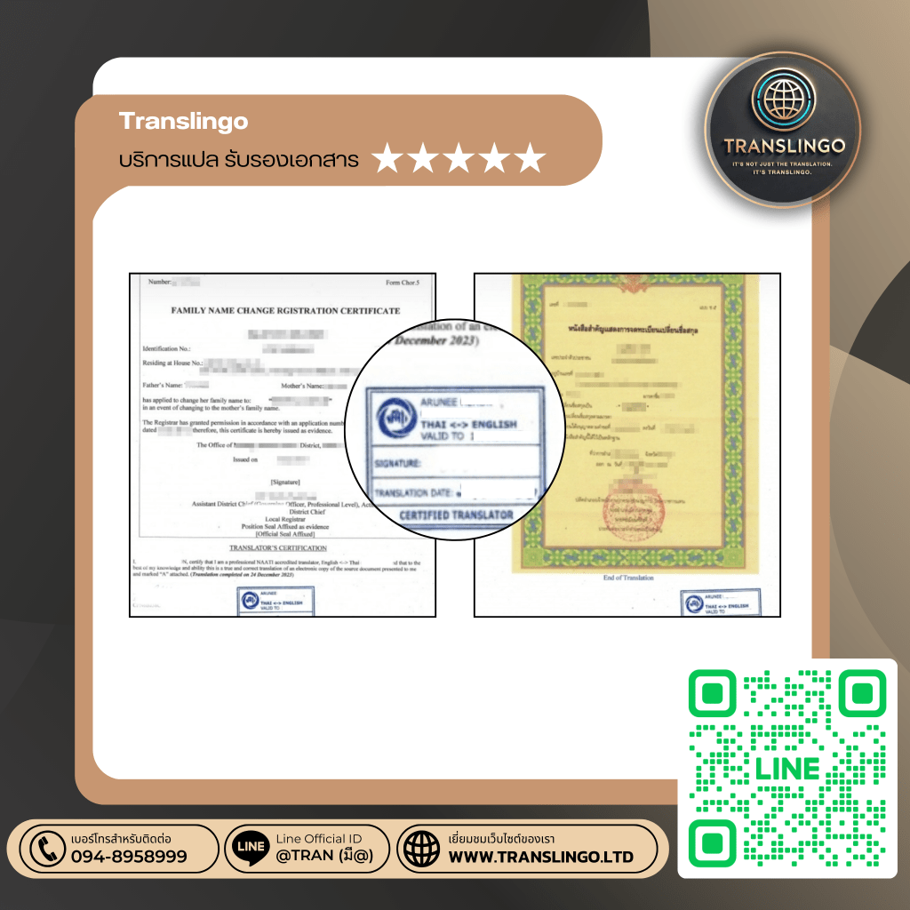 ส่งเอกสารและรับใบเสนอราคา: ลูกค้าส่งไฟล์เอกสาร (สแกน, PDF, หรือภาพถ่ายชัดๆ) มาทาง Line: @TRAN หรือ Email: translingo@ilc.ltd พร้อมแจ้งคู่ภาษาและบริการรับรองที่ต้องการ