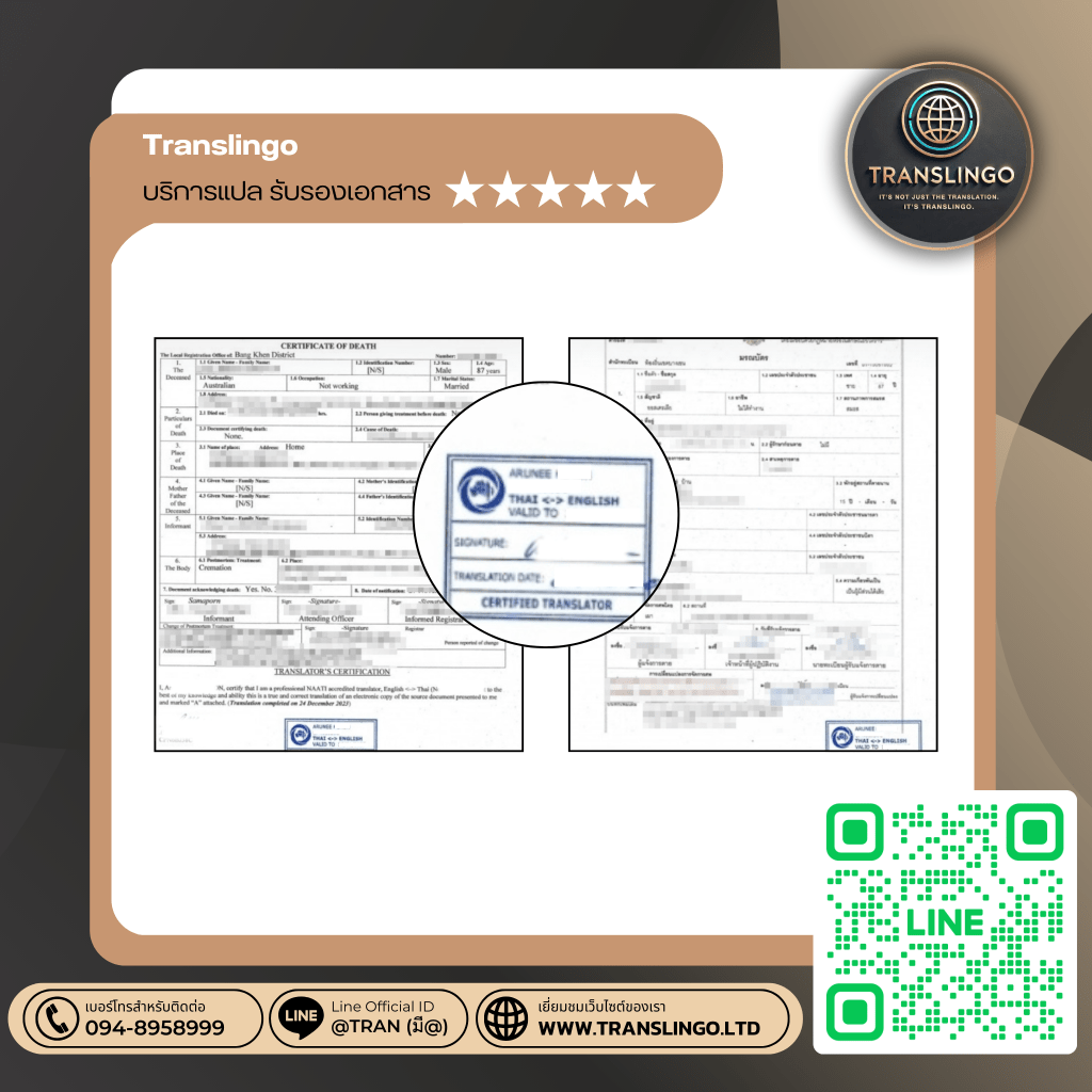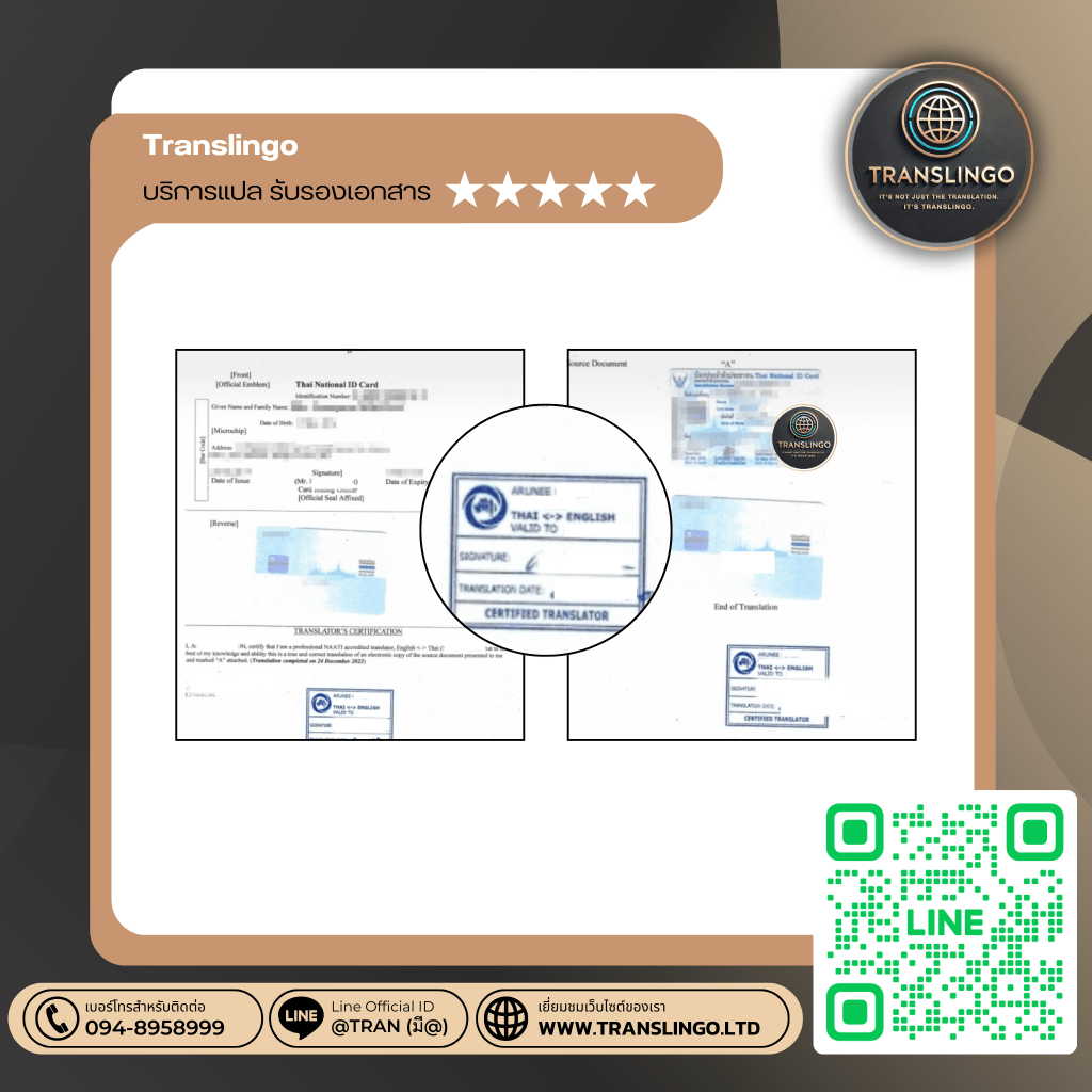 Translingo ให้บริการ นักแปล NAATI ภาษาไทยโดยเฉพาะ ซึ่งเป็นกลุ่มนักแปลที่มีจำนวนจำกัด และต้องผ่านการสอบที่มีอัตราการผ่านต่ำ ทำให้เอกสารภาษาไทย-อังกฤษที่ผ่าน NAATI มีคุณค่าและความน่าเชื่อถือสูงมาก