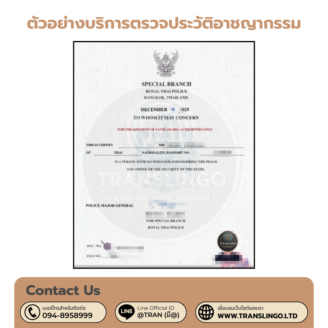 - การแปลเอกสาร: เอกสารภาษาไทยต้องได้รับการแปลเป็นภาษาอังกฤษ (หรือภาษาของประเทศปลายทาง) โดยใช้ถ้อยคำทางกฎหมายที่ถูกต้อง แม่นยำ และเป็นทางการ