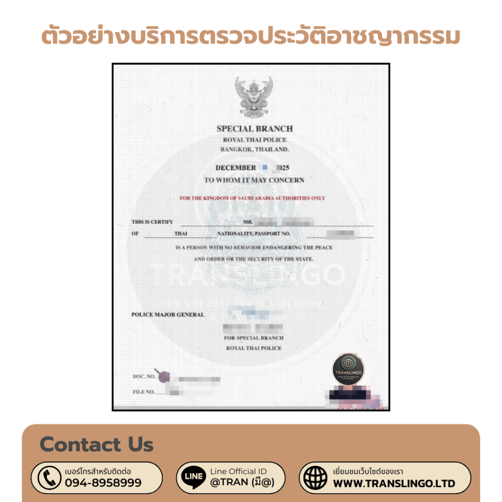 - ประวัติที่ “ไม่ใสสะอาด” (Adverse History): หากท่านเคยมีคดีความ แม้ว่าคดีจะสิ้นสุดแล้ว หรือได้รับการรอลงอาญา ข้อมูลเหล่านี้อาจยังปรากฏในระบบ การยื่นวีซ่าในกรณีนี้จำเป็นต้องใช้ “สำนวนคดี” และ “คำพิพากษาถึงที่สุด” ที่แปลเป็นภาษาอังกฤษและรับรองคำแปลอย่างถูกต้อง เพื่อชี้แจงต่อเจ้าหน้าที่กงสุล การปิดบังข้อมูลมักส่งผลร้ายแรงกว่าการเปิดเผยความจริง